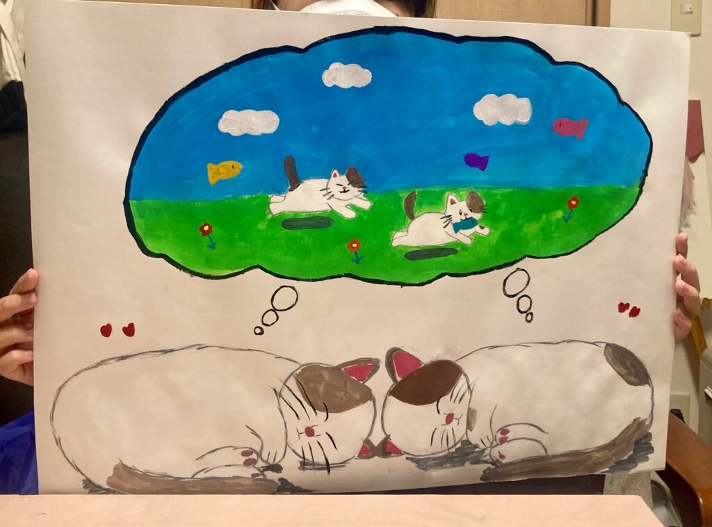 大好きな猫たち 2025年12月20日 最終更新日時 : 2025年12月20日 夜空豆金 鳥取県米子市でマンツーマンで、子ども絵画教室をやってる夜空豆金です。 大好きな猫たちの絵が完成しましたよ〜✨ 楽しい夢を見ている姿や夢の中のストーリーが見ていて楽しくなっちゃいますね♪ Follow me! FacebookXBlueskyCopy